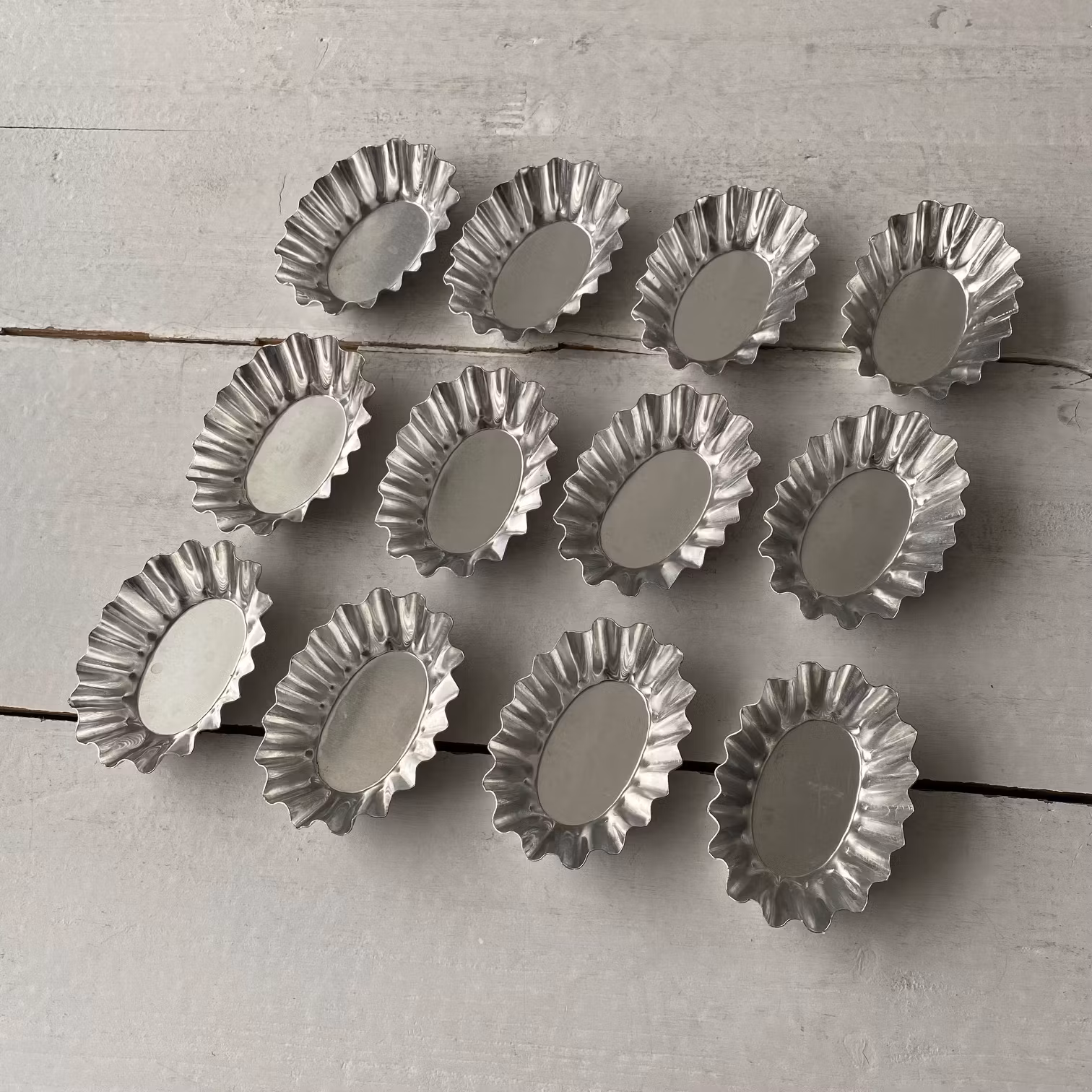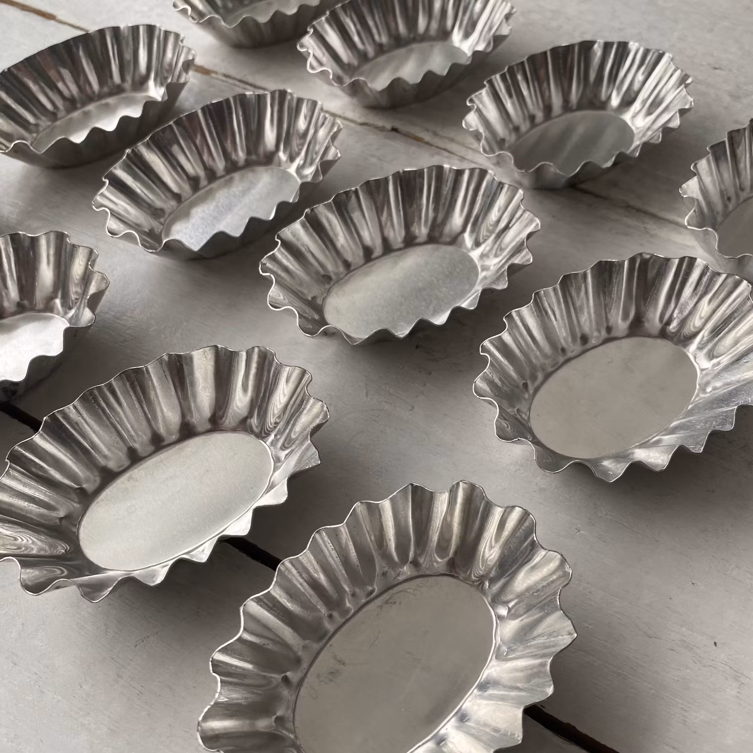 Praktiskt set med 12 ovala mandelformar i metall, perfekta för bakning av mandelkakor, småkakor, desserter och portionsbakverk. Formarna har ett mått på cirka 5 × 7 cm och ger ett jämnt och professionellt bakresultat.