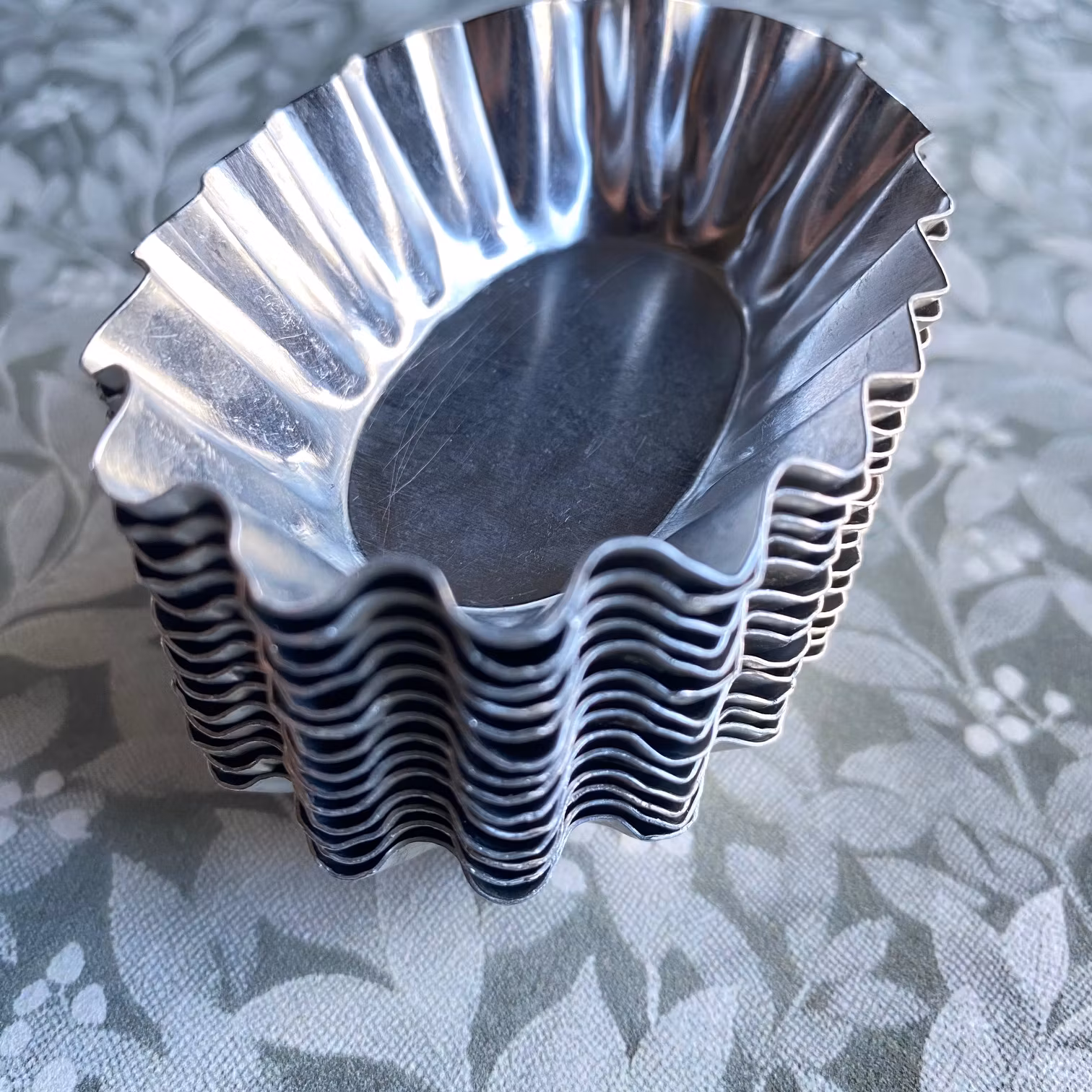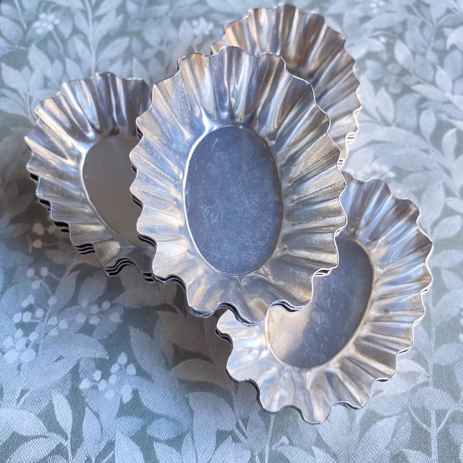 14 stycken ovala mandelformar och musselformar. Dessa charmiga formar är perfekta för den passionerade hemmabagaren som vill addera en nostalgisk touch till sina bakverk. Varje form säljs bär med sig spår av tidigare användning, vilket ger dem en karaktär och historia som nya formar saknar.
