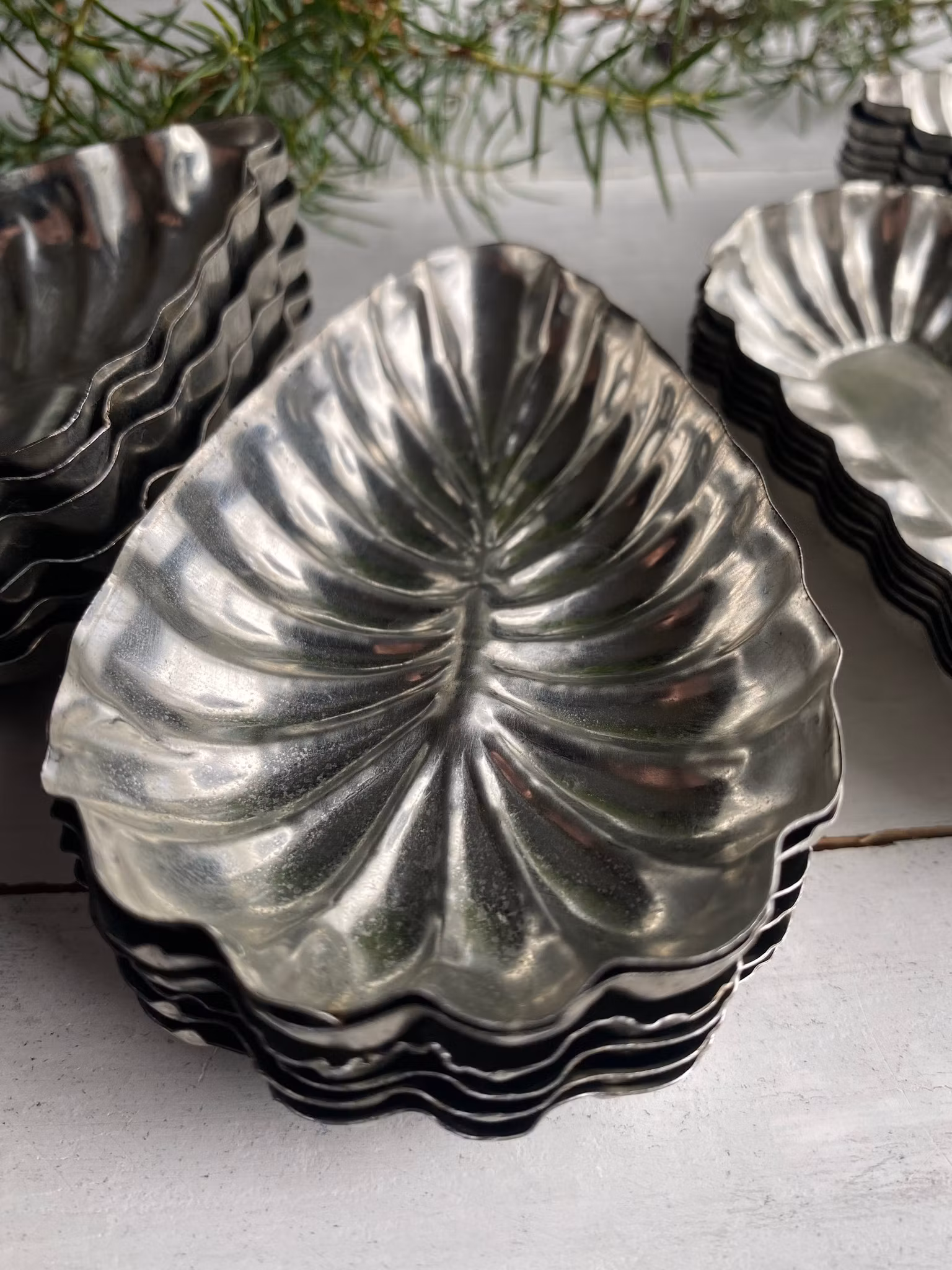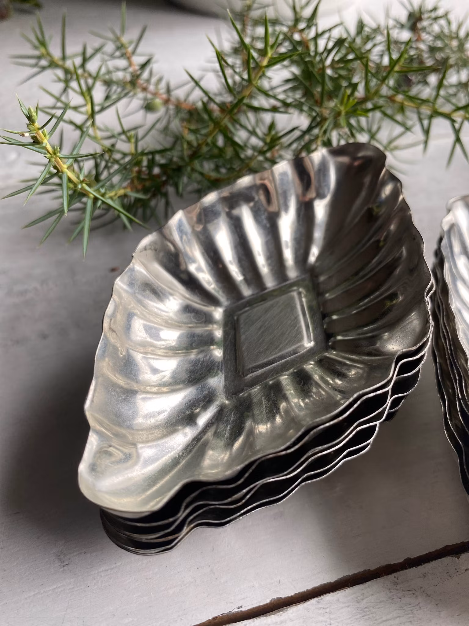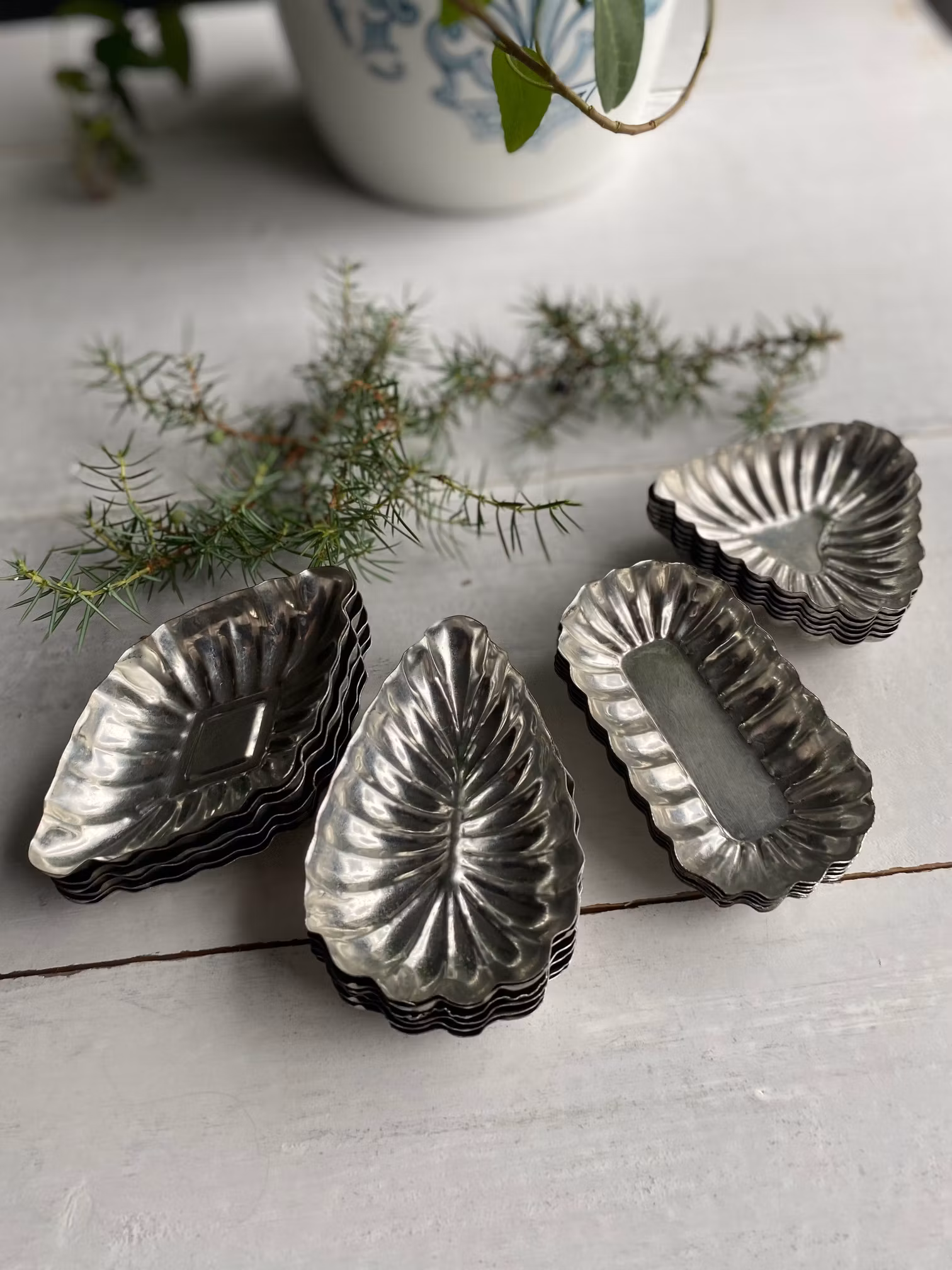 24 mandelformar, 4 olika mönster med 6 st av varje. Dessa charmiga formar är perfekta för den passionerade hemmabagaren som vill addera en nostalgisk touch till sina bakverk. Varje form bär med sig spår av tidigare användning, vilket ger dem en karaktär och historia som nya formar saknar.