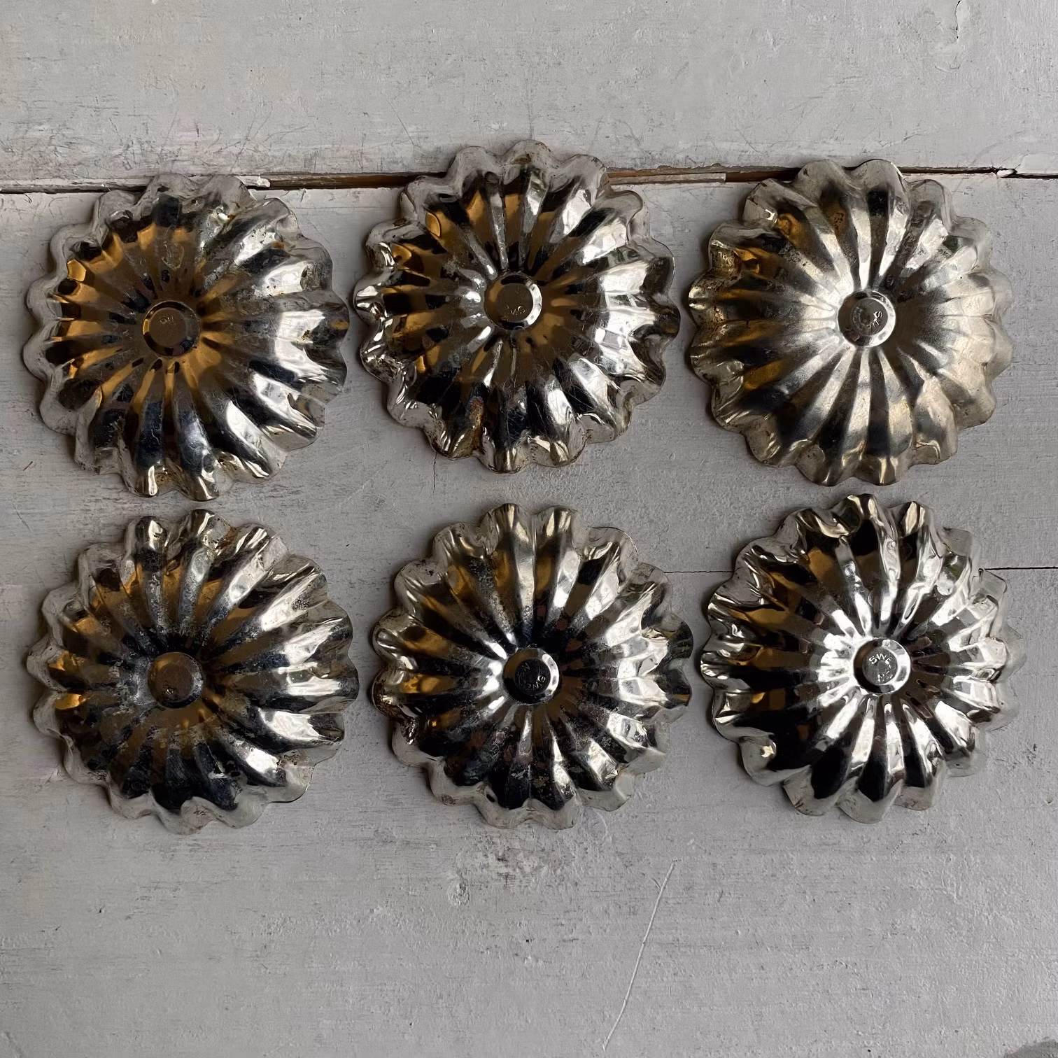Formarna är second hand och har rostfläckar, vilket ger dem en autentisk patina och ett charmigt, äldre uttryck. Perfekt för dig som söker äldre bakformar, vintage mandelformar eller klassiska metallformar med karaktär.