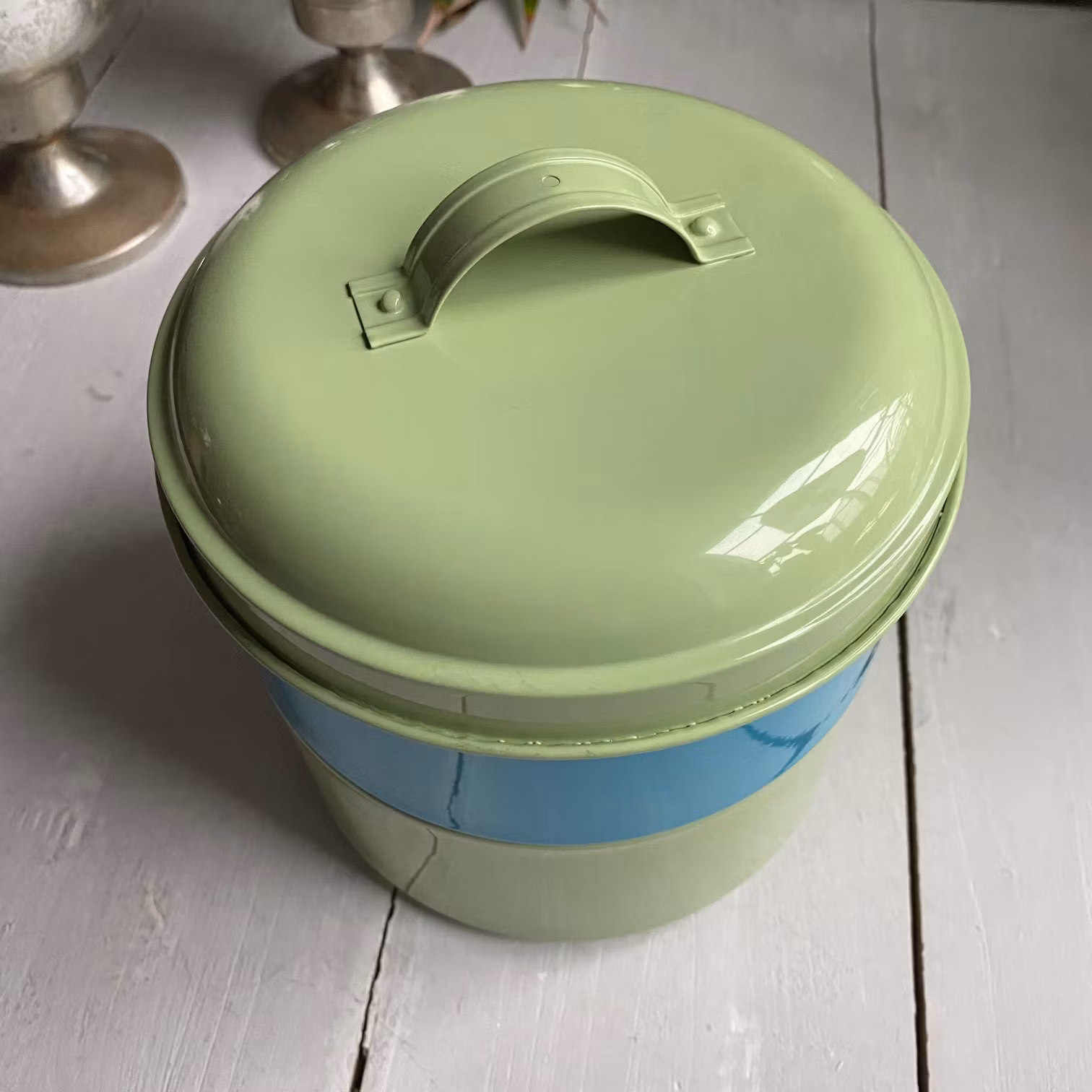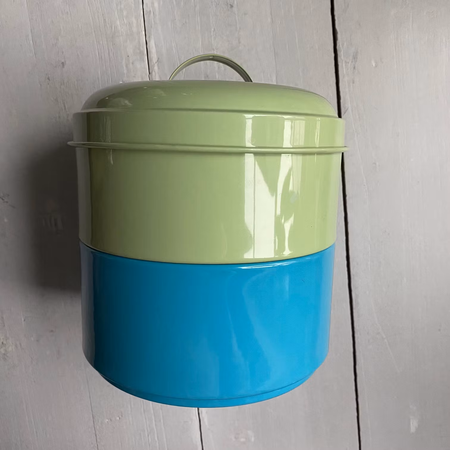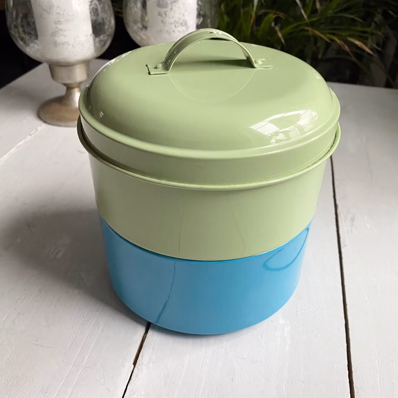Denna tvåvåningsburk är second hand, den är inte bara praktisk för förvaring av dina favoritkakor och sötsaker, men även en stilfull inredningsdetalj som andas nostalgi och värme. Med sina 16 cm i diameter och 15 cm höjd, är burken tillräckligt rymlig för att rymma allt från chokladbollar till bondkakor. Det stadiga locket ser till att dina bakverk får behålla sin fräschhet längre. Tillverkad i plåt, är den både robust och lätt att rengöra - perfekt för ett hem som älskar bakning!