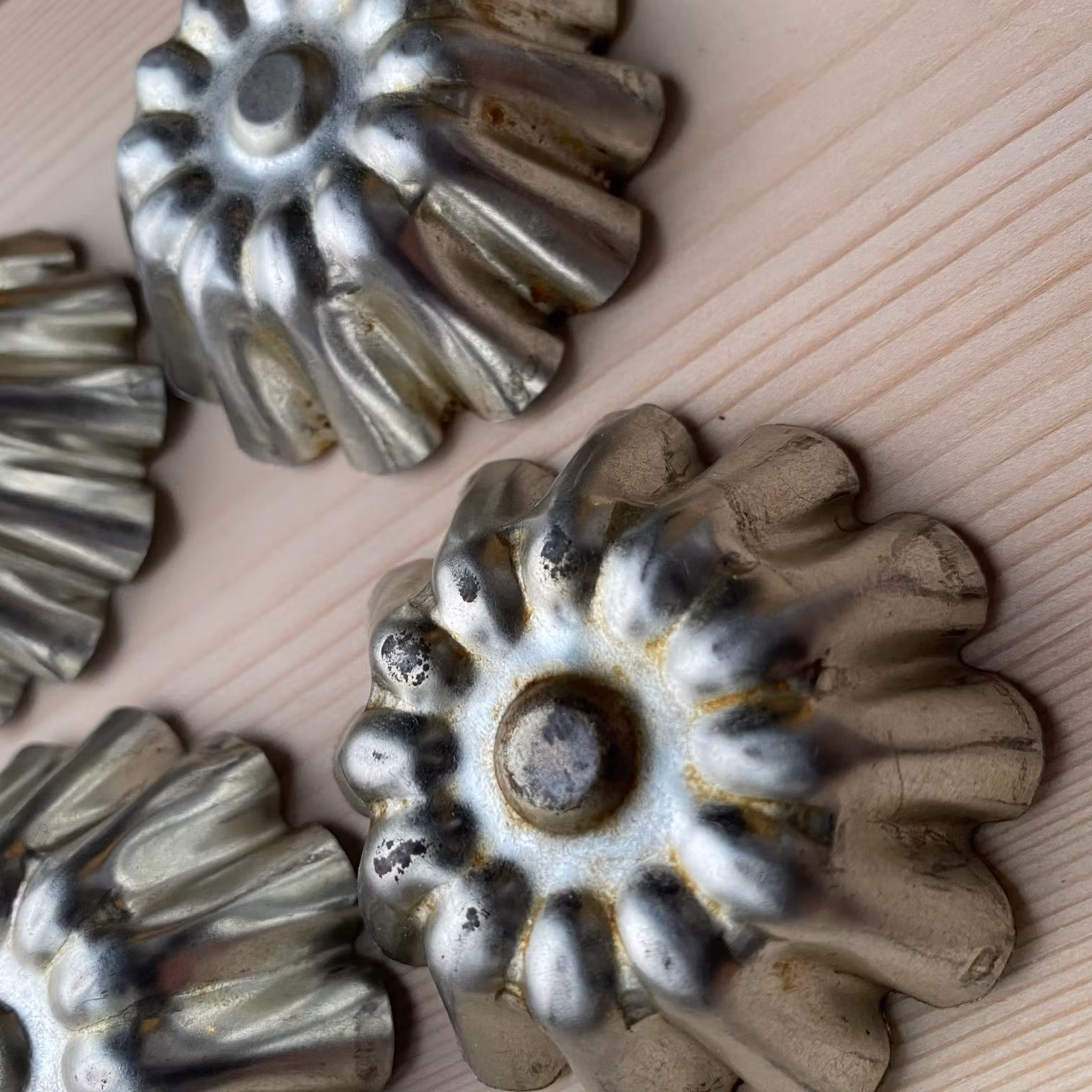 Formarna är second hand och spår av bakning kan finnas, vilket bidrar till deras genuina vintagekänsla. Ett utmärkt val för dig som söker äldre bakformar, vintage mandelformar i metall eller klassiska kakformar med vackert mönster.