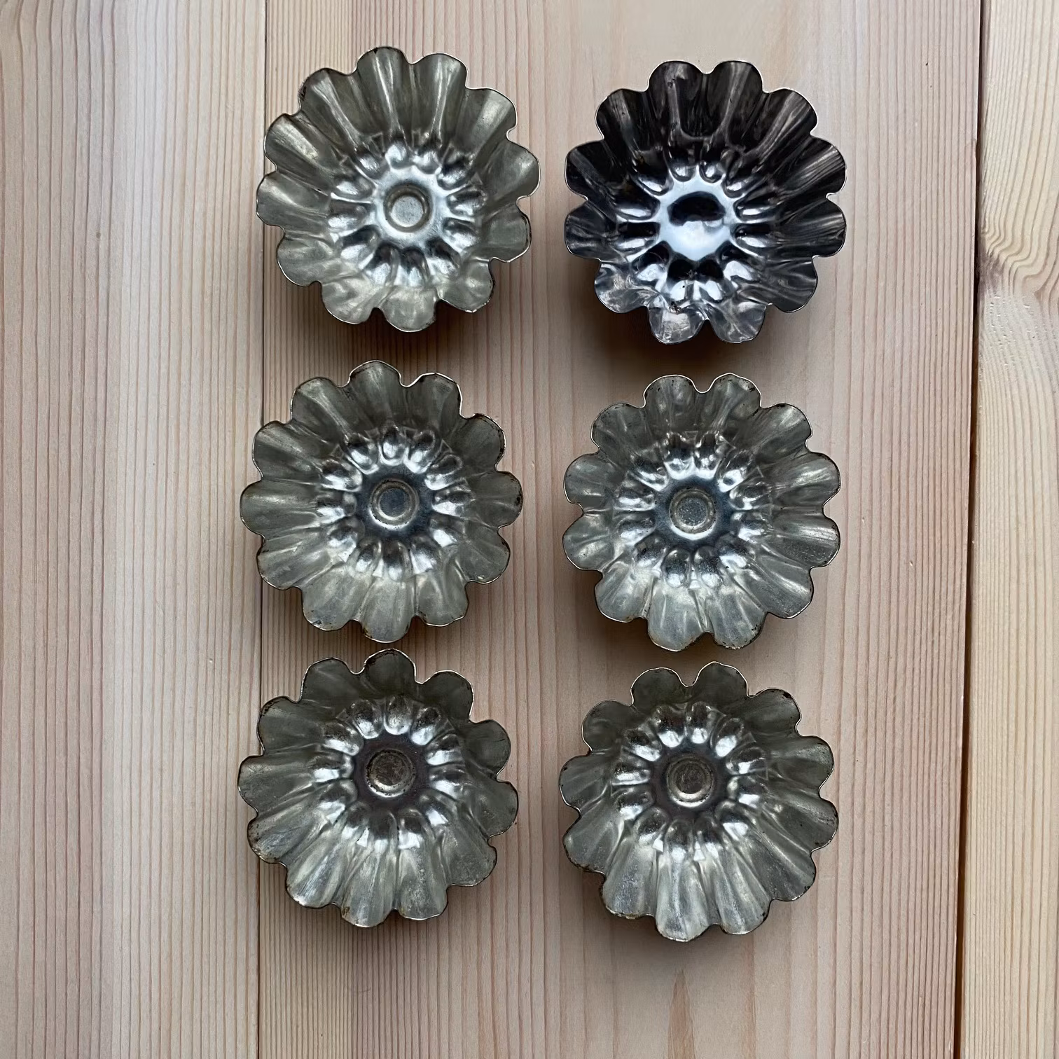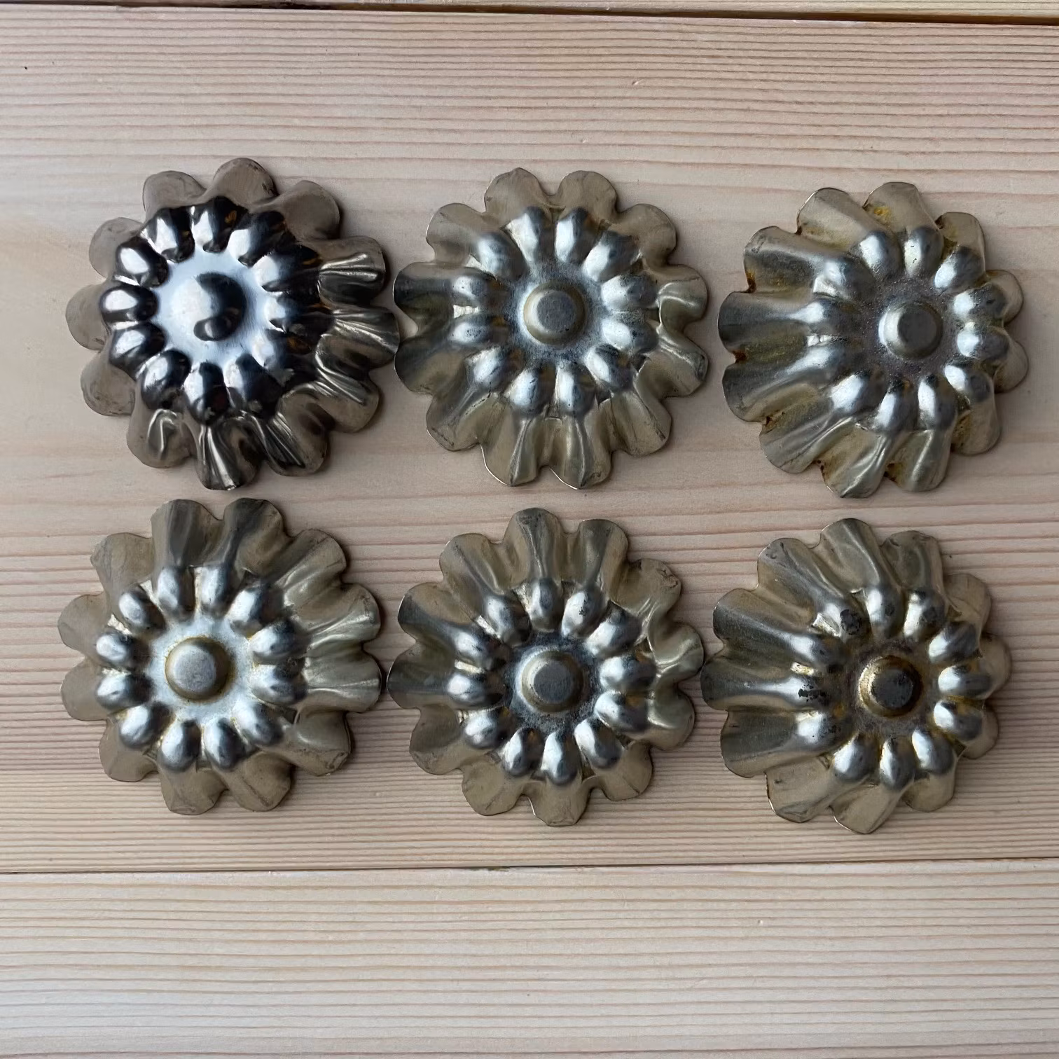 Set med 6 äldre mandelformar i metall med ett fint blomliknande mönster i botten, vilket ger ett dekorativt resultat vid bakning. Formarna har en diameter på cirka 5 cm och passar perfekt för klassiska mandelkakor, små bakverk eller desserter.