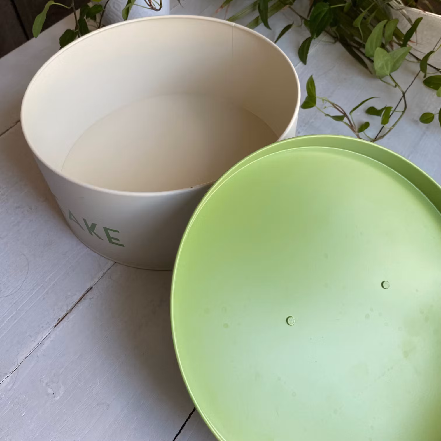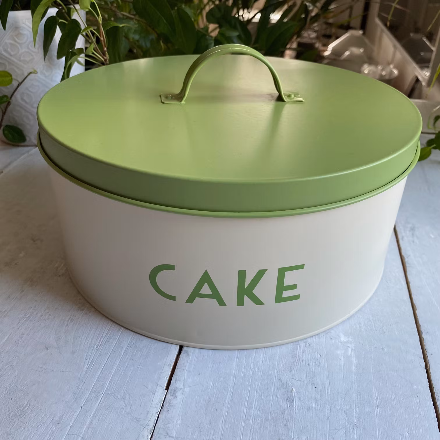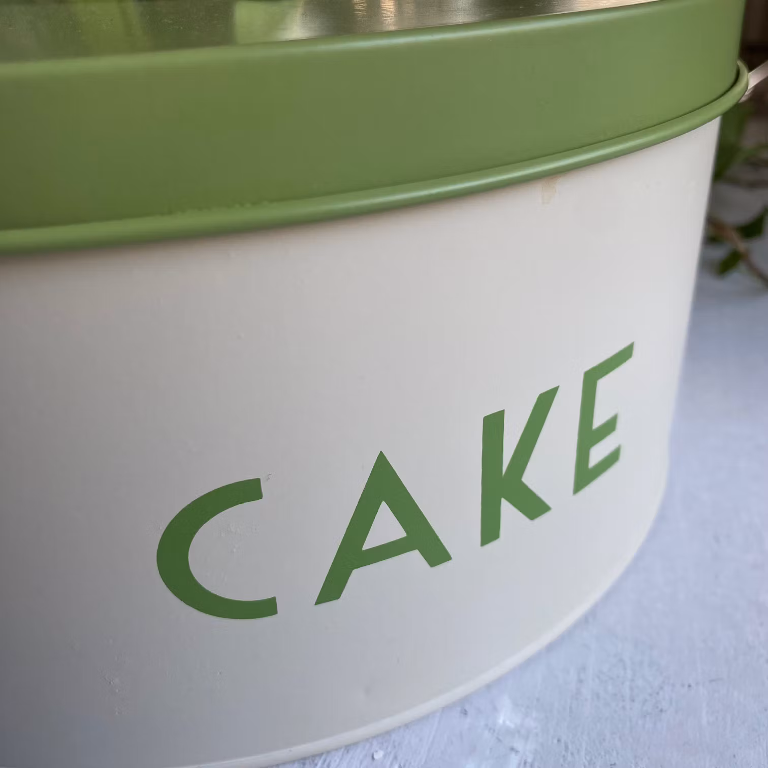 Burken har ett runt grönt lock och grön text som stavar 'CAKE', vilket gör den både funktionell och dekorativ. Perfekt för dig som älskar vintage och vill ha något unikt i ditt hem.