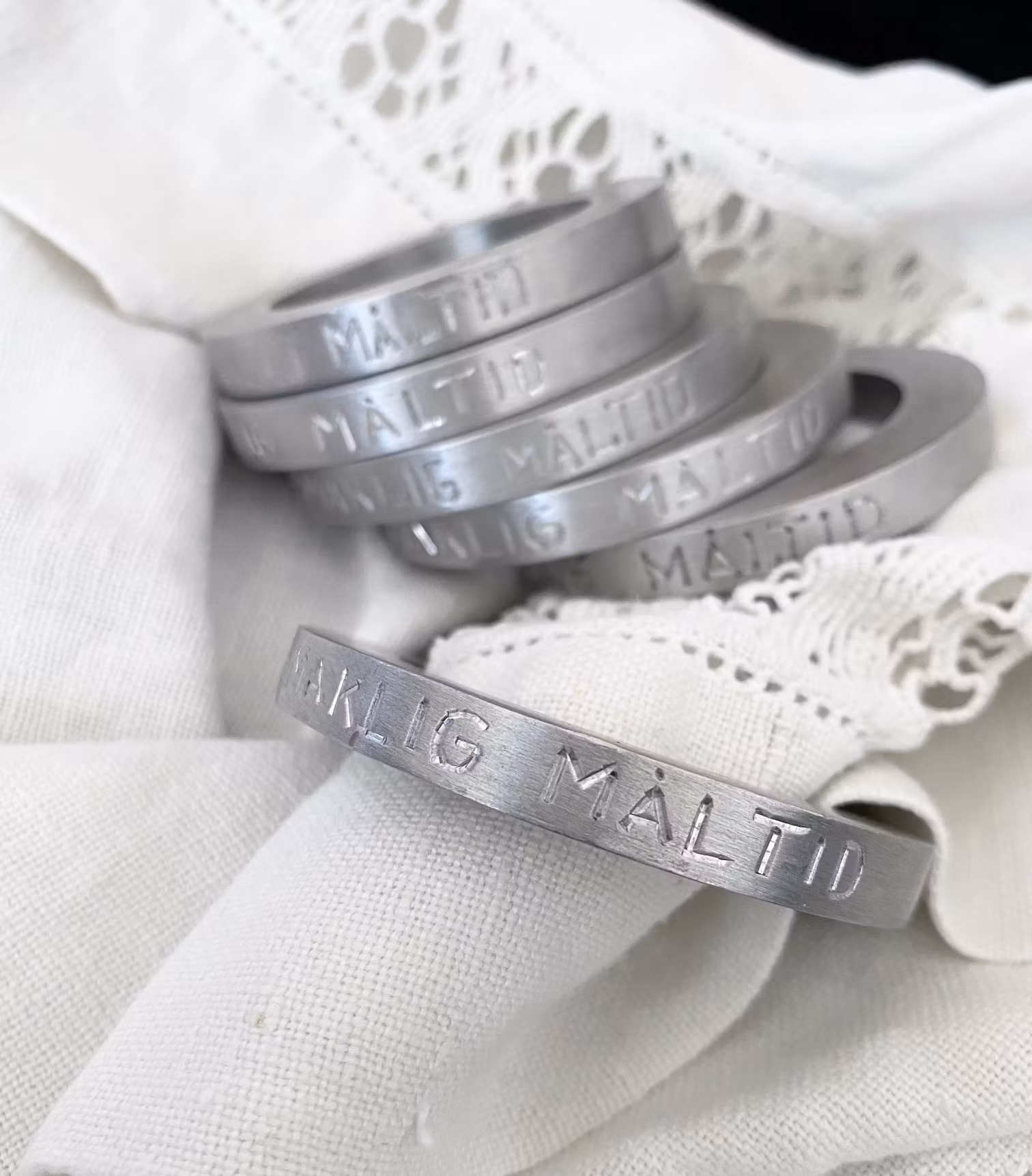 6 stycken servettringar i metall med texten "Smaklig måltid"