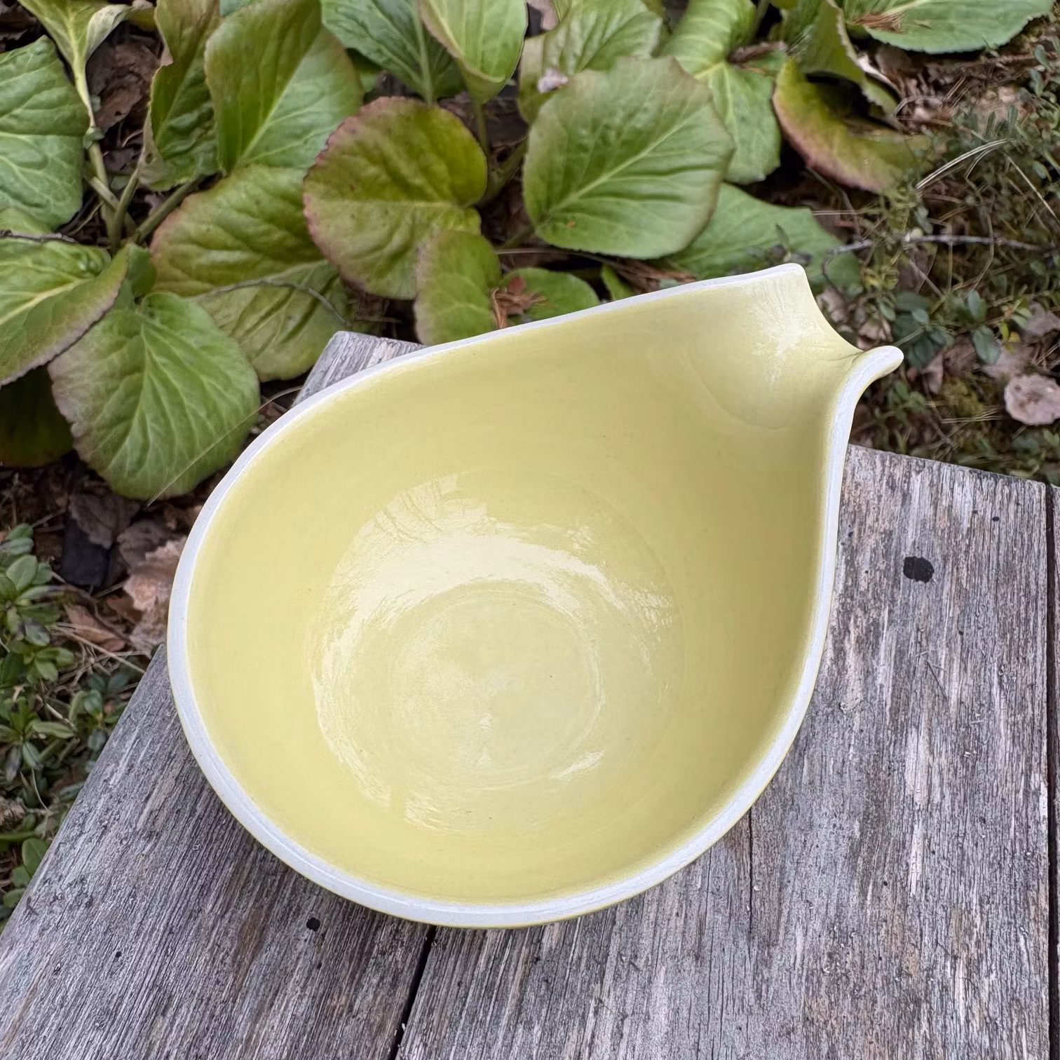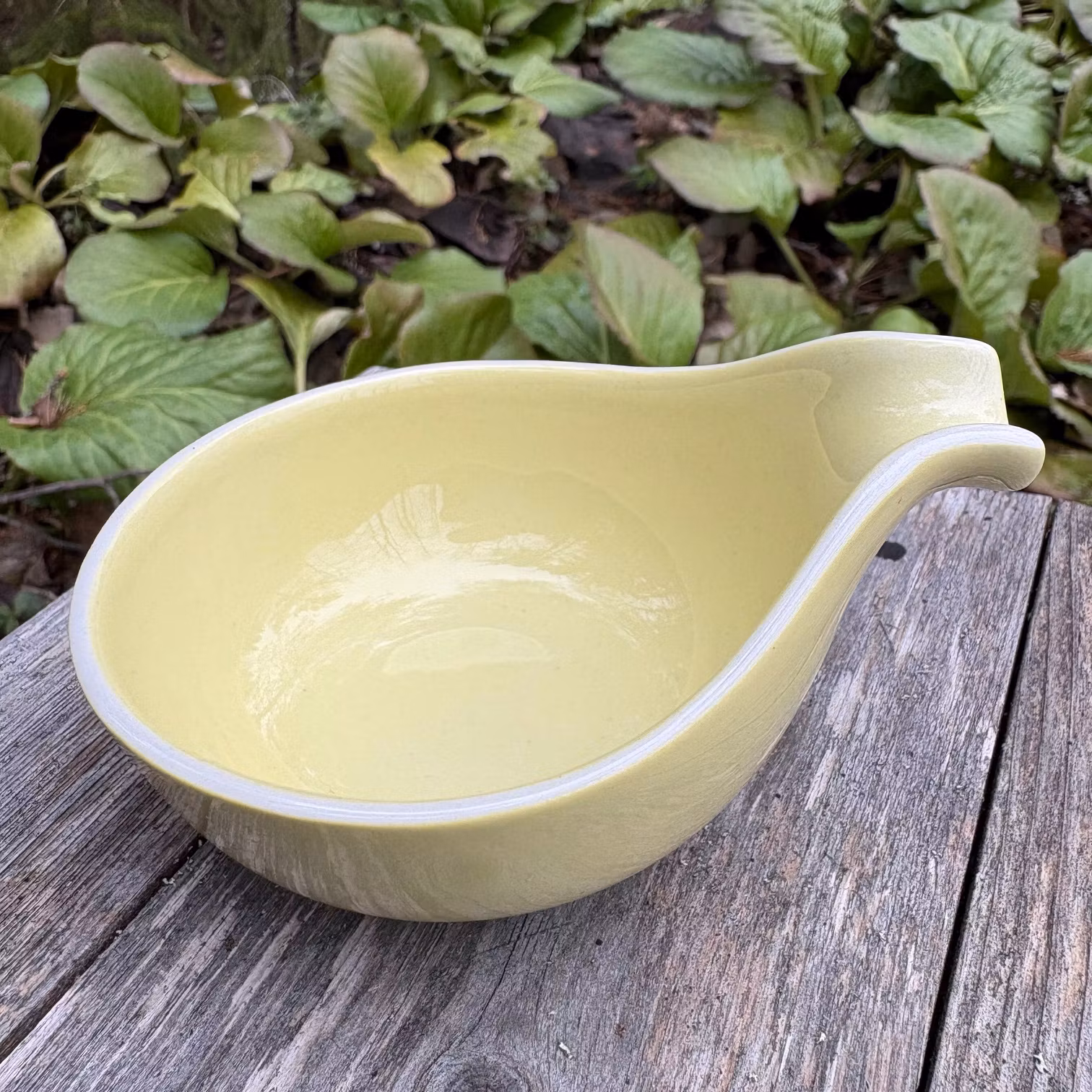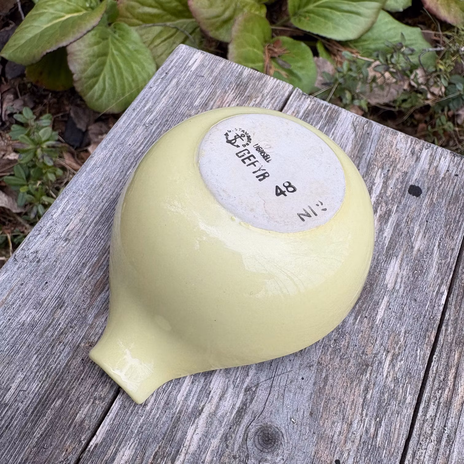 En charmig och tidstypisk skål ur serien “Gefyr”, formgiven av Stig Lindberg för Gustavsberg under 1950-talet. Den mjuka gula glasyren och den organiska formen med hällpip gör den både dekorativ och funktionell – perfekt som liten serveringsskål eller såsskål.