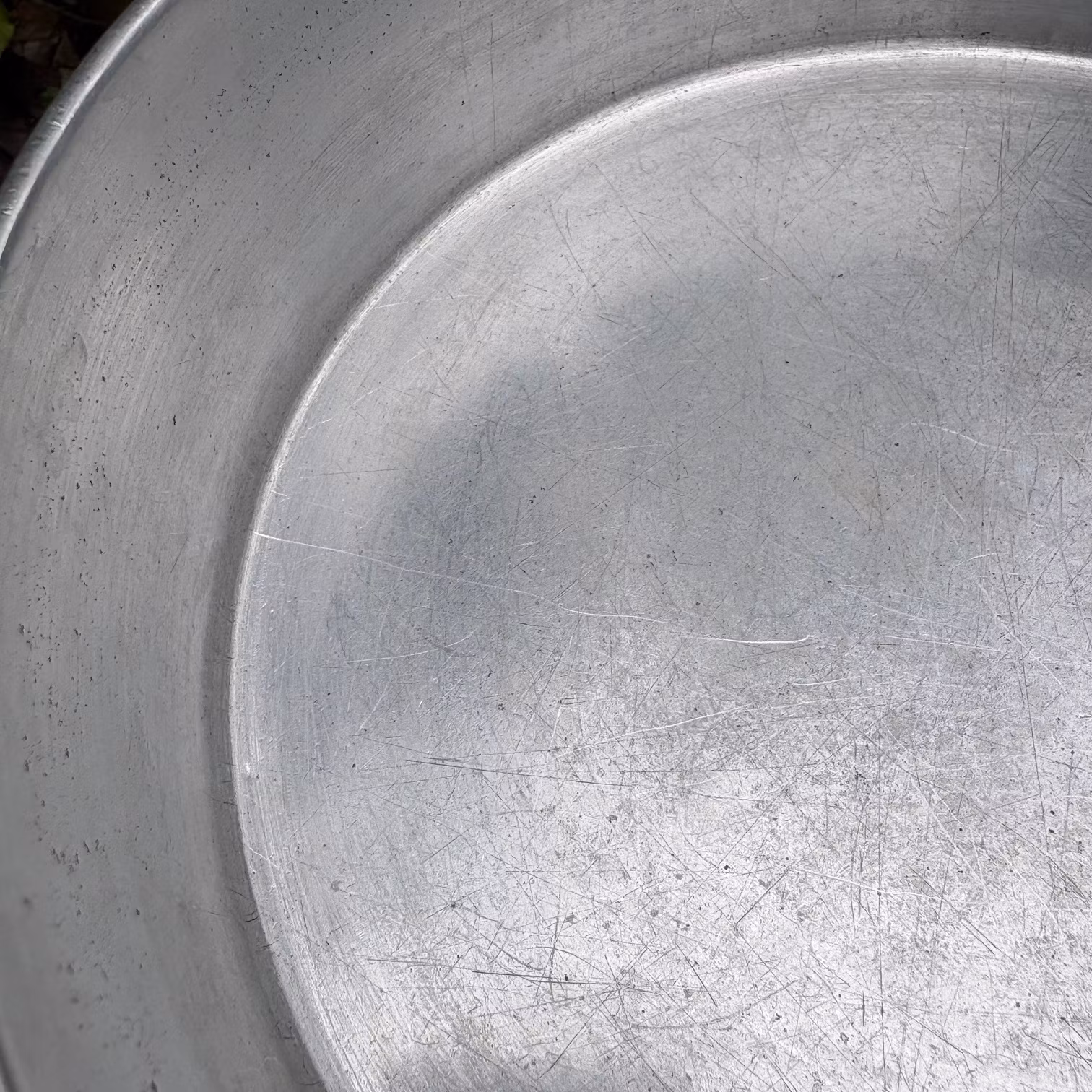 Second hand, stor slät rund form, putsad, spår av repor och andra märken finns.