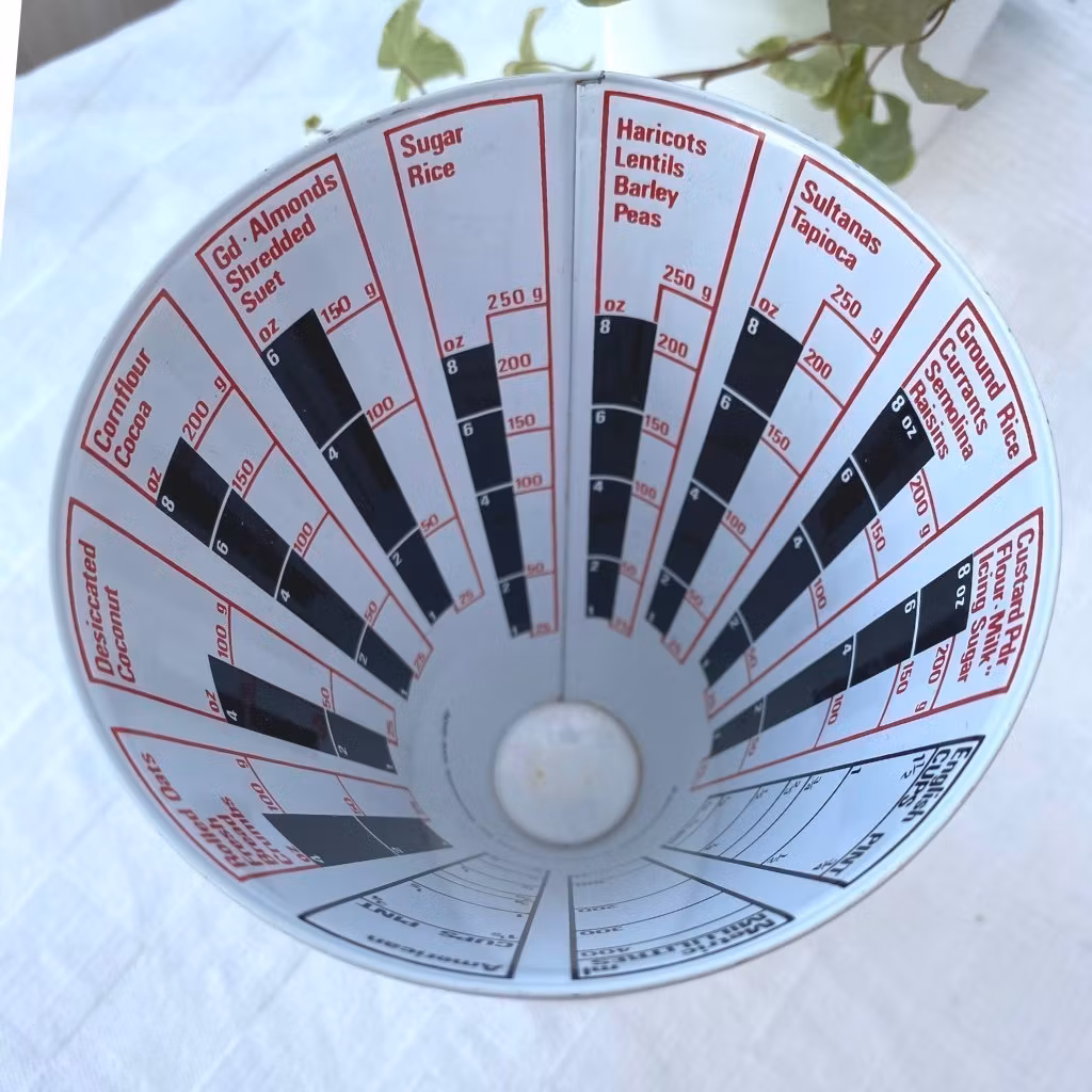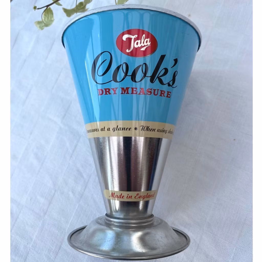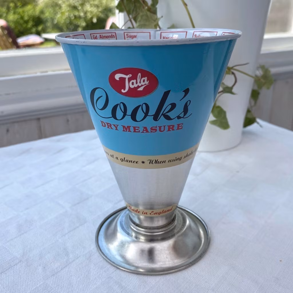 Begagnad i gott skick.Mått för engelsk cup, milliliter, ris, kakao och andra torrvaror, från engelska Tala.Höjd 14 cm.