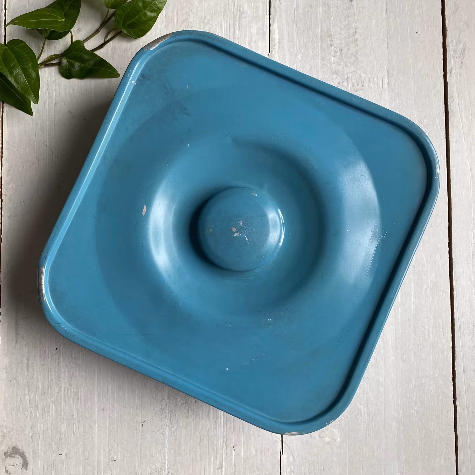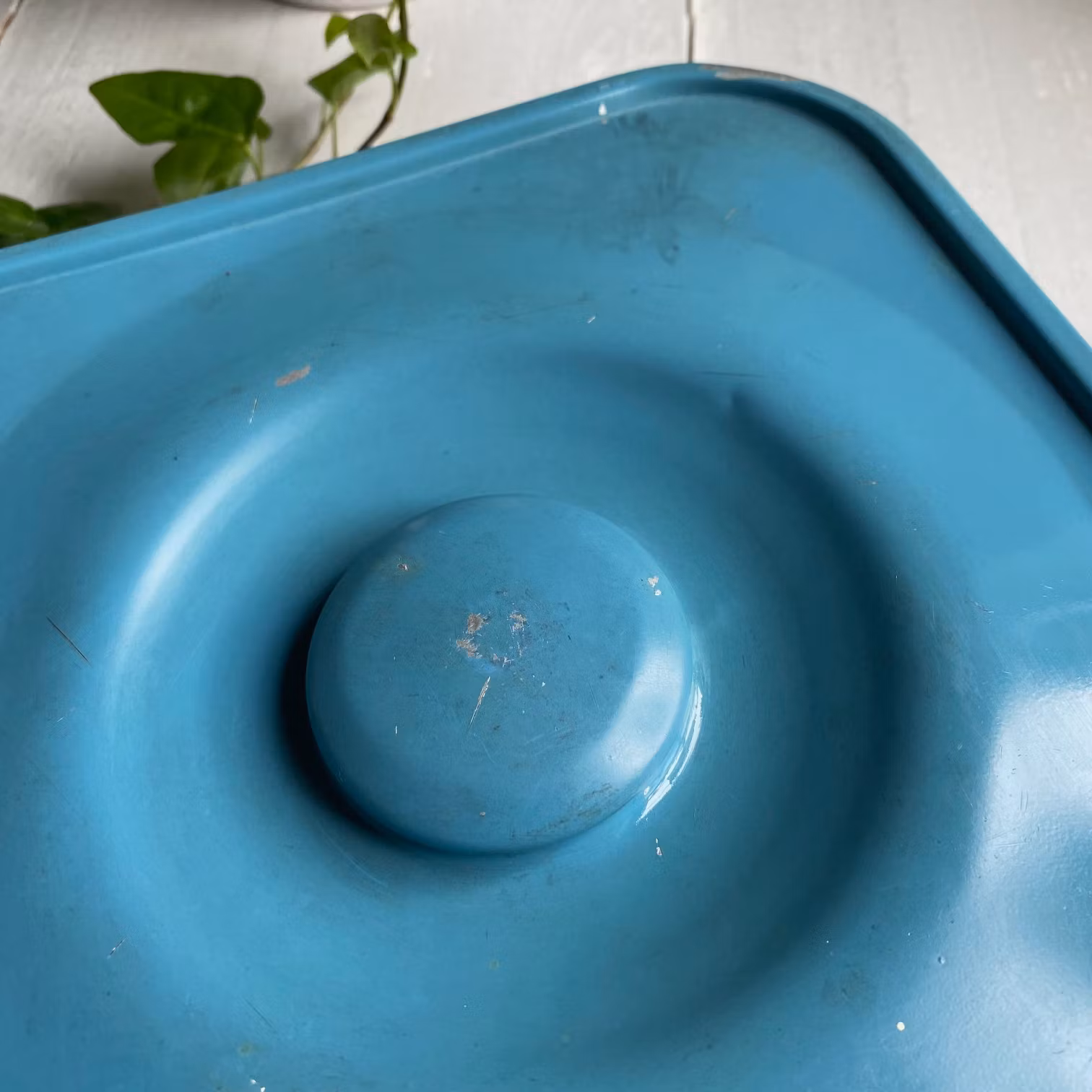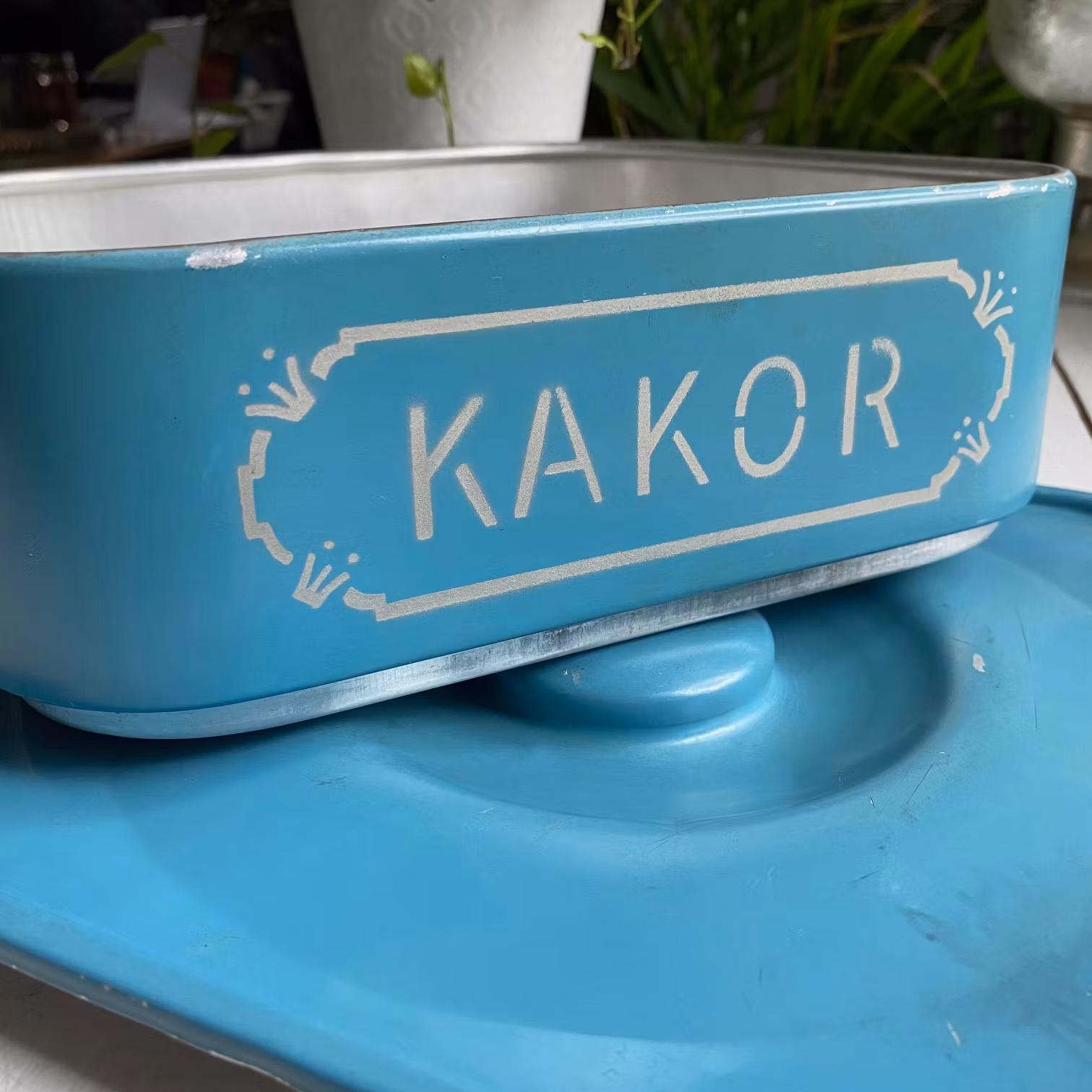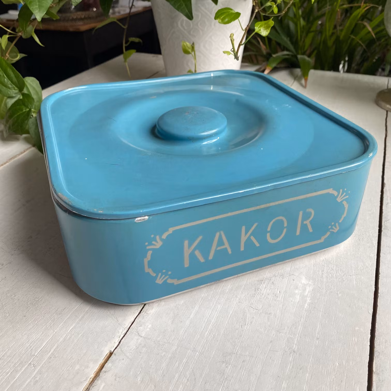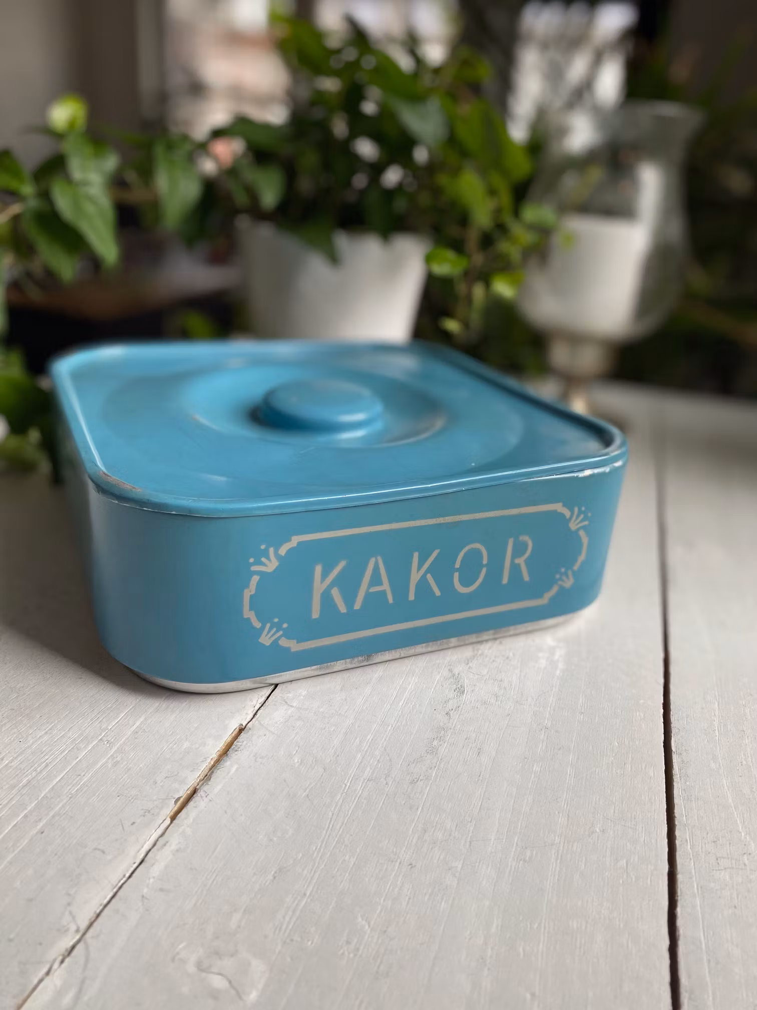Ge ditt kök en touch av tidlös elegans med denna vackra kakburk med lock. Tillverkad av aluminium och lackerad i en förtrollande turkosblå kulör, är denna kakburk både praktisk och vacker att se på. Den ska egentligen ha fler våningar men tyvärr finns endast denna kvar.