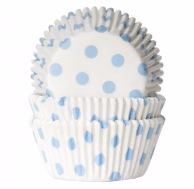 Vita muffinsformar med ljusblå prickar som är gjorda av ett kvalitetspapper från FSC-certifierade skogar. Muffinsformarna är "greaseproof", smörsäkra och de håller färg och form bra genom hela bakprocessen.
