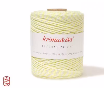 Tvåfärgat bomullssnöre i gul och vit. Med bakers twine kan du slå in fina paket som kommer bli mycket uppskattade av mottagaren. Häng även på en hängetikett där du skriver ett vackert meddelande för en personlig touch på paketet. Det fina bomullssnöret går även att använda till pyssel eller till när du sätter ihop buketter med blommor. Användningsområdena för vad du kan göra med en bit bomullssnöre är oändliga!