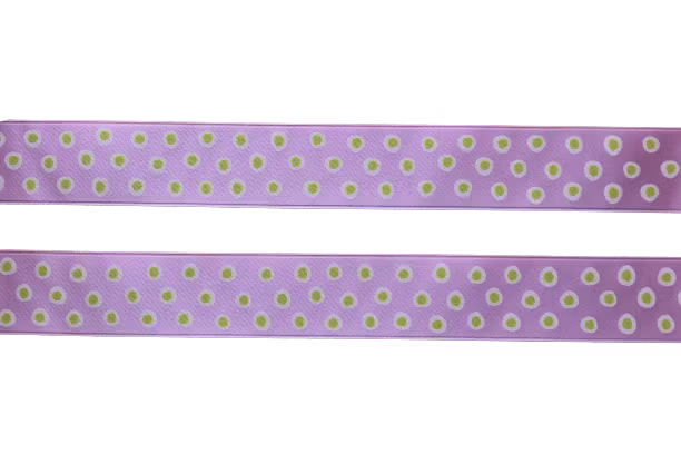 Fint lila sidenband med prickar som passar fint till att slå in presenter med eller för att dekorera med på kalas, dop mm. Knyt sidenbandet runt besticken när du dukar eller bind ihop blombuketter. Bandet går att använda till oändligt många saker! Satinband i färgen lila med ett tryck med gröna prickar på den ena sidan.