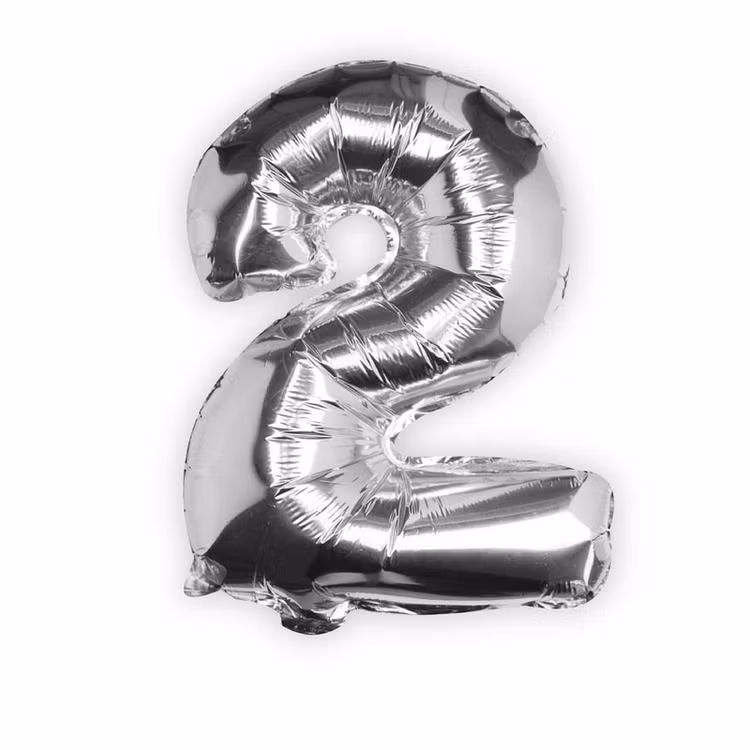 Silverfärgad sifferballong av folie som är formad som siffran två. Passar bra att hänga upp på både födelsedagskalas och nyårsfiranden. Fyll sifferballongen med luft och häng upp den på väggen.