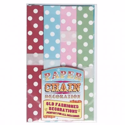 Pappersdekoration som passar till alla festligheter som kalaset med retrotema eller sommarpartyt. Den prickiga pappersgirlangen formar ringar med fyra olika färger som man fäster ihop med dubbelsidig tejp.