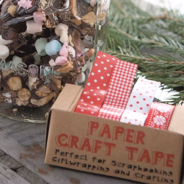 Dekorativ tejp till scrapbooking, paketinslagning mm. 4 olika färger. Totalt ca 5 meter. Bredd 15 mm. Material: papper/plast. Kan fästa lite dåligt på vissa material, komplettera gärna med vanlig dokumenttejp.