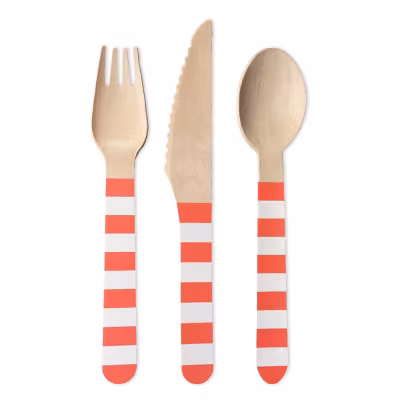 Engångsbestick av björk med ränder. Träbestick med en enkel morden design som kommer göra den simplaste kalasdukningen mycket festligare. Träbestick som är fina att använda till både kalas och bröllop. Duka bordet med flermatchande tillbehör.
