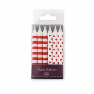 Röda tårtljus från Paper Eskimo. Randiga och prickiga röda ljus som passar fint till födelsedagskalaset eller kanske till baby showern. Att få blåsa ut tårtljus på sin födelsedag är viktigt för att man ska få kunna göra sin önskan, det är någonting som bara händer en gång om året, så ta vara på det!