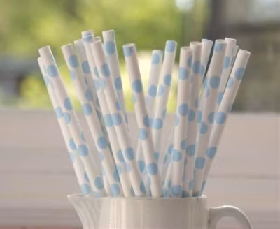 Ljusblå prickiga papperssugrör som är biologiskt nedbrytbara och där både papperet och trycket är godkänt för livsmedel. Papperet är giftfritt och klorfritt och trycket på sugrören är av livsmedelssäkert bläck. Sugrören löses inte upp i drycken utan håller länge och de har ingen dålig lukt eller smak. Passar utmärkt till barnkalaset, festen eller i din somriga smoothie.