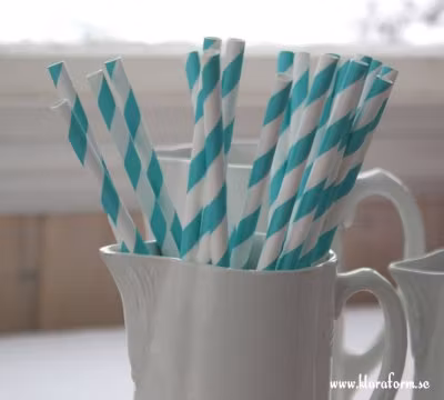 Turkos randiga papperssugrör som är biologiskt nedbrytbara och där både papperet och trycket är godkänt för livsmedel. Papperet är giftfritt och klorfritt och trycket på sugrören är av livsmedelssäkert bläck. Sugrören löses inte upp i drycken utan håller länge och de har ingen dålig lukt eller smak. Passar utmärkt till barnkalaset, festen eller i din somriga smoothie.